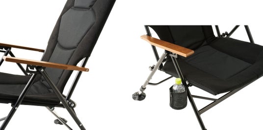 アームレストに木製パーツを使用することで、アウトドアから家のインテリアにも馴染む。手元にドリンクを入れられるドリンクホルダー付きで便利。