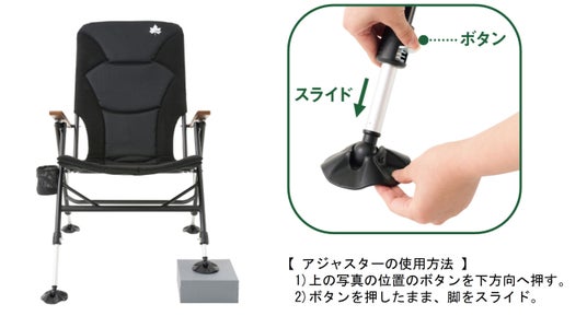 また、4本脚それぞれの高さをアジャスター機能で無段階調節できるため、地面状態にかかわらず水平に設置することが可能なうえ、前後2本ずつの高さを変更することで、お好みの角度に傾けることができます。そのうえ、脚の接地部分は可動パーツを使用しているため、傾斜面でも座面が水平になるよう設置することができます。
