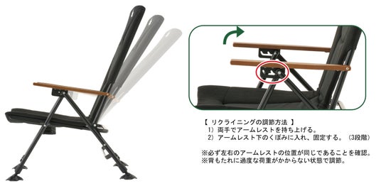 背もたれには3段階リクライニング機能を搭載しており、お好みの高さと角度でリラックスできます。リクライニングの調整方法は、両手でアームレストを持ち上げ、アームレスト下のくぼみに入れて固定するだけなので簡単です。