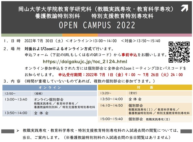 国立大学法人岡山大学(本部:岡山市北区、学長:槇野博史)の大学院教育学研究科では、研究科(教職実践専攻・教育科学専攻)、養護教諭特別別科、特別支援教育特別専攻科のオープンキャンパスを、2022年7月30日(土)にZoomによるオンライン方式と対面方式の両方で開催いたします。