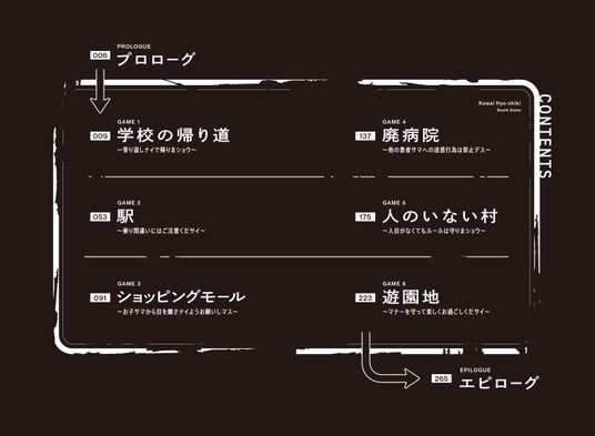 学校の帰り道、駅、ショッピングモール、廃病院など、さまざまなシチュエーションで繰り広げられるデスゲーム6編を収録しています。