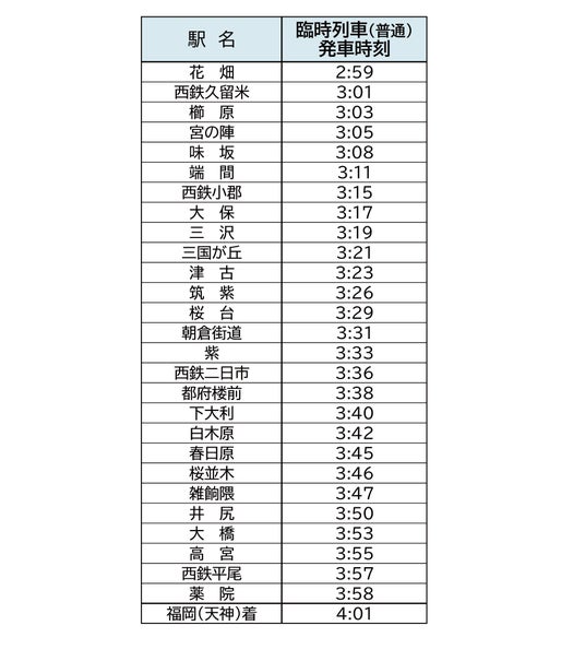西日本鉄道(株)では、2025年7月15日(火)の早朝に行われる「博多祇園山笠(追い山笠)」にあわせて、臨時列車を運行いたします。