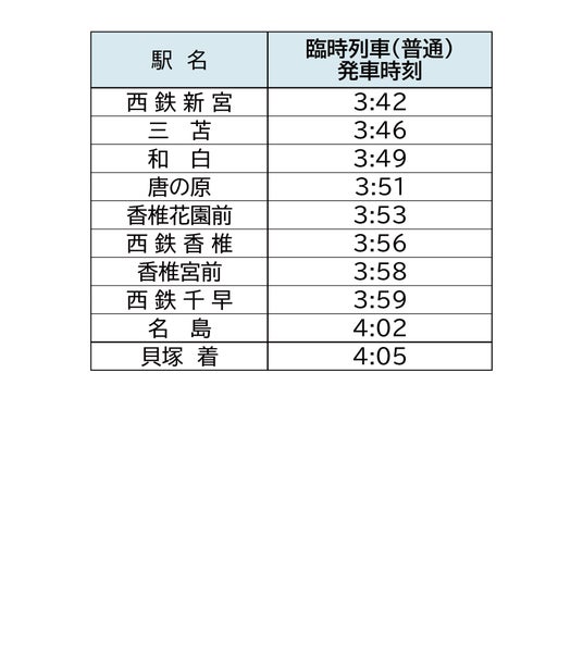 臨時列車は、毎年「博多祇園山笠(追い山笠)」の開催に合わせて運行しており、ご利用のお客さまに大変ご好評いただいております。今回は、早朝に天神大牟田線1本(花畑発福岡(天神)行き 普通)、貝塚線1本(西鉄新宮発貝塚行き 普通)の計2本を運行し、お客さまのニーズにお応えします。