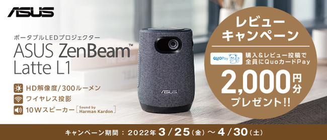 キャンペーン期間内にASUS ZenBeam Latte L1ポータブルプロジェクターを購入・ECサイトにレビューを投稿した方全員にQUOカードPAY 2000円分をプレゼント!
