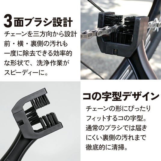 チェーン洗浄を手軽に行える3面構造のチェーンブラシです。