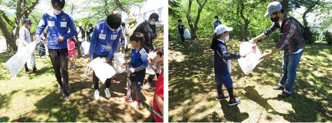 清掃活動では選手とスタッフ、観客、地元の少年サッカークラブの子供たちが、試合会場周辺の緑地帯で1時間に渡りごみ拾い作業を一緒に行いました。試合会場の周りをきれいな環境で維持したいという参加者の思いもあり、草むらに隠れていた細かなごみも探すなど、一生懸命に活動していました。