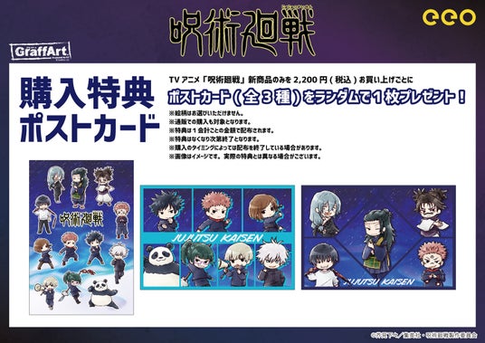 TVアニメ『呪術廻戦』新商品のみを2,200円(税込)お買い上げごとに、ポストカード(全3種)をランダムで1枚プレゼント!