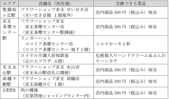 本企画は、多摩市愛宕地区、日野市百草などにお住まいの高齢者の方200名にビーコン(発信機)をし、ビーコンを所持した参加者が、聖蹟桜ヶ丘駅、京王多摩センター駅、京王永山駅、高幡不動駅の各駅周辺にする「ポイントスポット」に来店した場合や、専用の見守りアプリをインストールした方(以下「サポーター」と称します。)とすれ違った場合にポイントがたまる仕組みです。たまったポイントは、各駅にあるフラワーショップ京王各店など指定店舗において、50ポイント毎に生花などの景品と交換することができます。今回は第1弾での実験結果をもとに対象地区を拡大し、ビーコン配付者を増やして実施します。