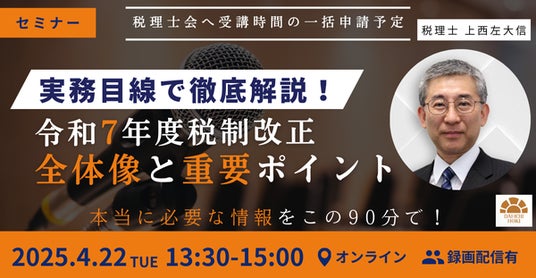事業承継税制の見直しや相続税の物納制度の改正、中小企業向けの法人税制の特例延長や投資促進税制の拡充など、税理士が押さえておくべき主要項目を厳選し、その改正の全体像となかでも特に重要なポイントを解説いただきます。