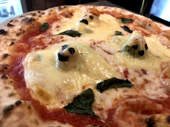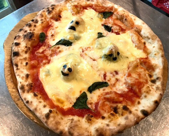 ESOLA各店舗で一番人気の呼び声高く、ワインにも合うマルゲリータ。このマルゲリータの上に可愛いおばけが登場!見て楽しい、食べて美味しい一品です。