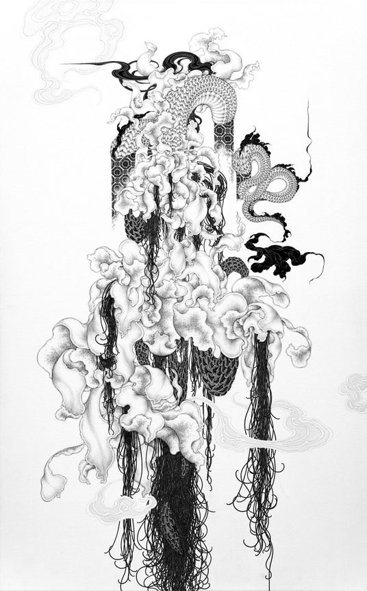 みなぎる雨間の鱗片や文様の雲、額縁モチーフの小品を描いているとき、私は雪山に横たわる一頭の豹を思っていました。そこから戻ることもせず臥している姿は晴れやかで、美しく、強靭で、憧れです。