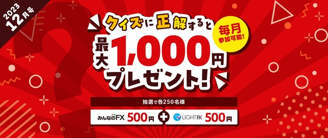 トレイダーズホールディングス株式会社(東京証券取引所スタンダード市場8704)のグループ会社で、外国為替証拠金取引事業(FX取引)等を営むトレイダーズ証券株式会社(本社:東京都渋谷区、代表取締役:須山 剛、以下「トレイダーズ証券」)は、2023年12月1日(金)より外国為替取引サービス「みんなのFX」及び「LIGHT FX」において、「【みんなのFX & LIGHT FX口座開設者対象】クイズに挑戦して最大1,000円もらおう!」を実施することを決定しました。
