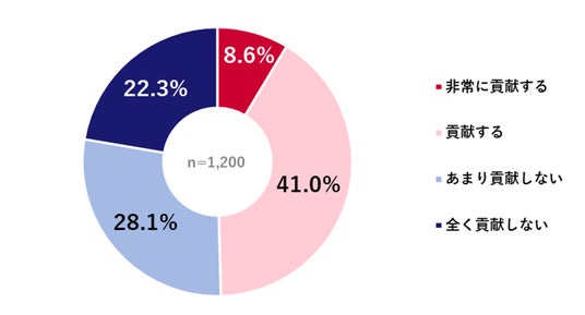 「大阪・関西万博」が地元経済にどの程度貢献すると思うか伺ったところ、「非常に貢献する」(8.6%)、「貢献する」(41.0%)を合わせると約半数を占めた。