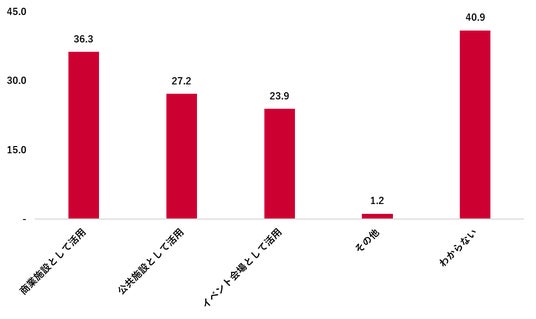 会期終了後、夢洲(ゆめしま)の施設がどのように活用されるのが望ましいかについては、「商業施設として活用」が36.3%、「公共施設として活用」が27.2%だった。一方で、「わからない」が40.9%となった。