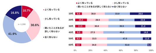 大阪・関西万博の認知率は、「よく知っている」(10.7%)、「少し知っている」(30.6%)を合わせると、41.3%だった。年代別で見ると年代が低くなるほど「全く知らない」と回答した人が多く、10代では28.0%だった。