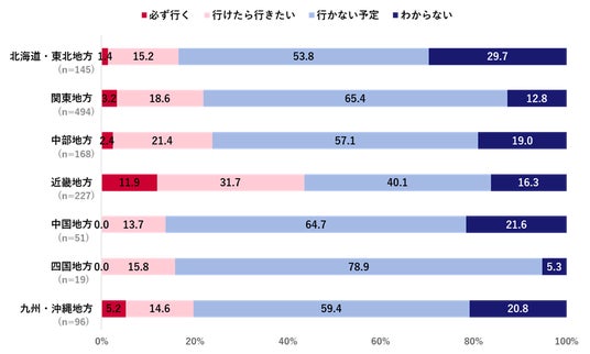 居住地別で見ると、開催地に近い「近畿地方」在住者では「必ず行く」(11.9%)、「行けたら行きたい」(31.7%)を合わせると43.6%となり、他の地方と比較して関心の高さが伺える。