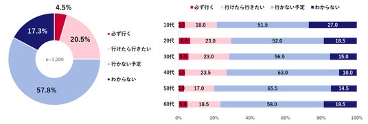 「大阪・関西万博」に行く予定について聴取したところ、「必ず行く」が全体の4.5%、「行けたら行きたい」が20.5%となり、合わせると25.0%だった。全体の4人に1人に来場意向が伺える。