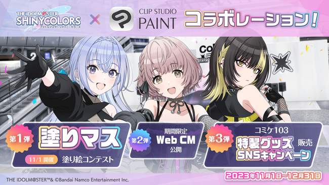 セルシスのイラスト・マンガ・Webtoon・アニメーション制作アプリ「CLIP STUDIO PAINT」が、11月1日(水)より「アイドルマスター シャイニーカラーズ」とコラボレーションします。ゲーム内で新たに登場するアイドルユニット「CoMETIK」(コメティック)の斑鳩ルカ、鈴木羽那、郁田はるきが様々な企画を通じ、クリエイターの創作活動を応援します。