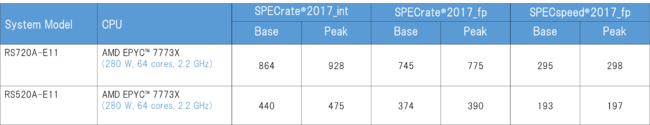 AMD EPYC™ 7773Xプロセッサーを1基搭載した同系サーバーのRS520A-E11は、374 SPECrate(R)2017_fp_baseという記録的なスコアを達成しています。
