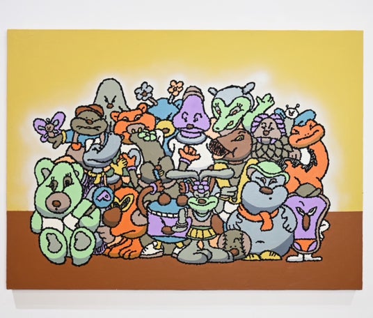 企業ロゴや商品パッケージなど、消費社会の記号をモチーフに絵画作品を制作するアーティスト。家族のルーツが沖縄にあるその作品は、沖縄を通じて子供の頃から触れてきたアメリカ文化の影響が大きい。一見ポップアートのような印象を受けるが、前途で触れた通り彼自身の個人的な経験・記憶によって形成されている。その作風はポップアートが持つフラットかつアイコニックな表現とは異なり、荒々しいタッチによる断片的なモチーフの描写が特徴。また作品シリーズによってはキャンバスを破って縫い合わせるなど、絵画のフォーマットを逸脱した表現がある。作品は時にペンキ塗りが重ねられた工場の外壁やビルボードを切り取ったかのようであり、都市の中で堆積された時間や環境の変化を感じさせる。