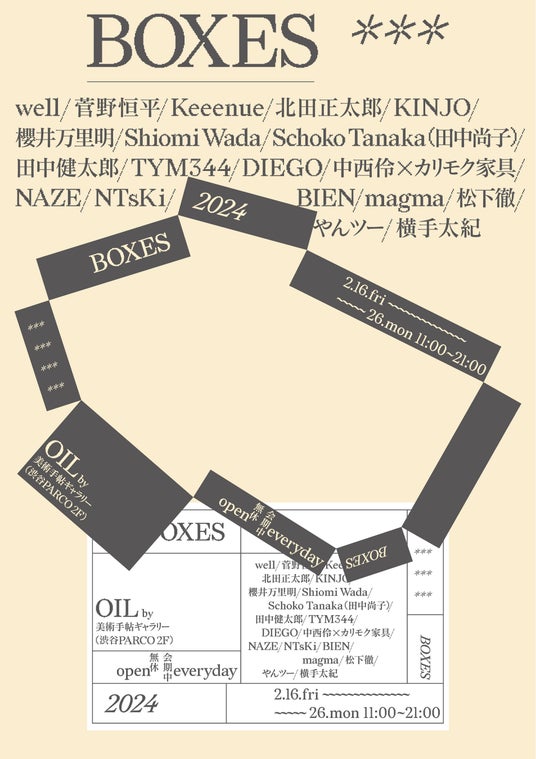 OIL by 美術手帖ギャラリーでは、2月16日(金)よりグループ展「BOXES」を開催いたします。本展では、絵画、音楽、写真などさまざまなジャンルのアーティスト・クリエイター19組が同じサイズの箱を素材に制作した作品を展示いたします。