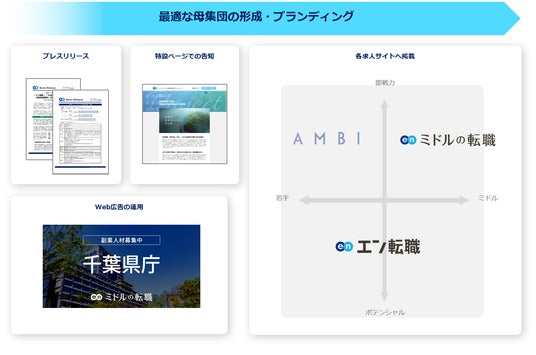 プレスリリースや特設ページ、Web広告での告知に加え、各求人サイトでの集客支援を実施。『エン転職』『AMBI』『ミドルの転職』とターゲットの異なる3つの求人サイトを活用することで、ターゲットへ網羅的に求人を届けました。