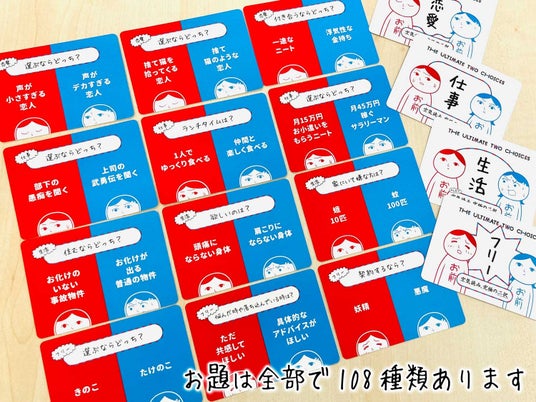 1.「仕事」「恋愛」「生活」「フリー」の4つのテーマから親はお題を1つ選び、究極の⼆択のうちどちらかを選択し、投票カード(赤or青)を裏にして場に置きます。