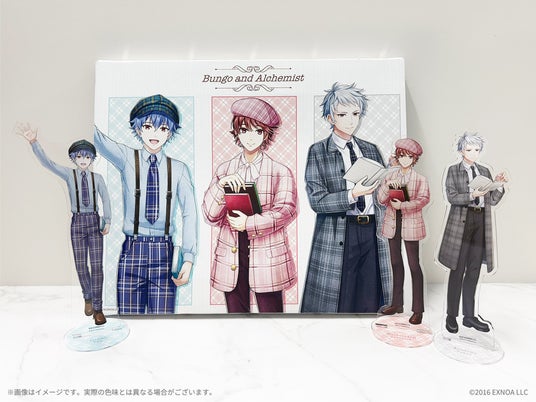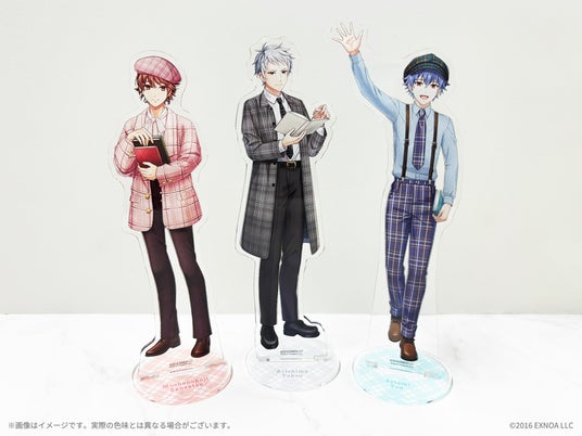 アクリルスタンドは、大きさおよそ15cm。チェック柄の私服を身にまとった武者小路実篤、有島武郎、里見弴の全身を描いたグッズです。