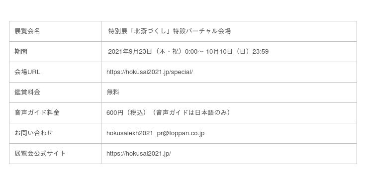 凸版印刷株式会社(本社:東京都文京区、代表取締役社長:麿 秀晴、以下 凸版印刷)は、2021年9月17日(金)まで東京ミッドタウン六本木で開催した葛飾北斎 生誕260年記念企画 特別展「北斎づくし」をオンラインでも楽しめる特設バーチャル会場(以下 特設バーチャル会場)を、2021年9月23日(木・祝)から10月10日(日)まで無料公開します。