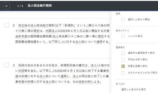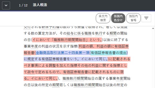 - 「括弧内省略」機能:条文中の括弧内を非表示。