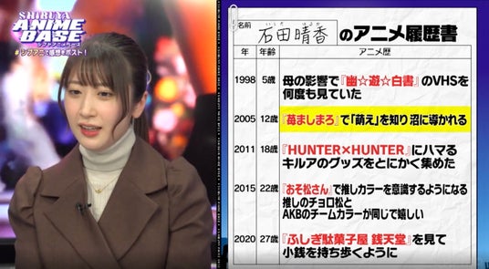 石田さんは、1998年、5歳のときに母の影響で『幽☆遊☆白書』のVHSを見ていたことからアニメの世界に足を踏み入れ、2005年、12歳で『苺ましまろ』で「萌え」を知り、アニメ沼に導かれたと当時を懐古。2011年に、18歳で『HUNTER×HUNTER』にハマり、推しはキルアだったそう。2015年には『おそ松さん』で推しカラーを意識するようになったとのことで、「推しのチョロ松が緑で、そのときのAKB48の自身のチームカラーも緑で『わあ…推しを感じられている』と思った」と語ります。