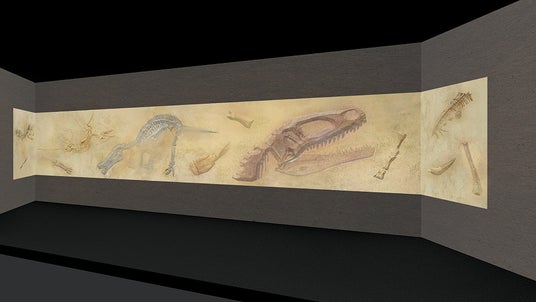 ゾーン3:バーチャル発掘体験コーナー「カセキはっけん!」3つの壁面にちりばめられた化石をみつけて、発掘ツールで掘り出すバーチャル体験をお楽しみいただけます。制限時間内に掘り出すと、その恐竜の全身のイラストと名前が現れるなど、ワクワクする映像空間をお楽しみいただけます。