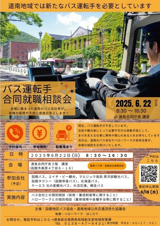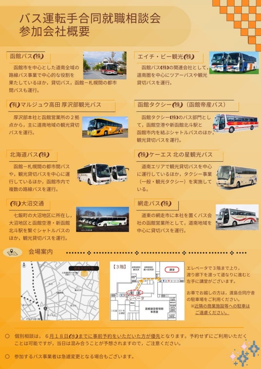 道南地域の8つのバス会社がバス運転手に興味や関心のある方、バス運転手への就職・転職を検討されている方をお待ちしています!未経験の方、大型二種免許未取得の方もお気軽にご参加ください!