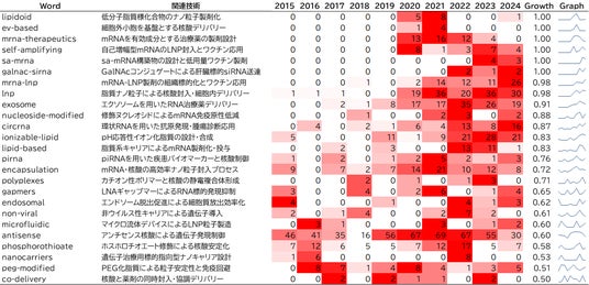 図1:核酸DDSに関連する特許におけるキーワードの年次推移(2015~2024年)