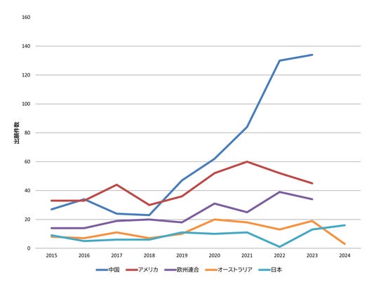 つづいて、特許出願数の国別動向です。企業や研究機関の出願する特許の傾向には、社会実装が近い、あるいはすでに実装済みである技術と関連する短中期の動向が反映されます。