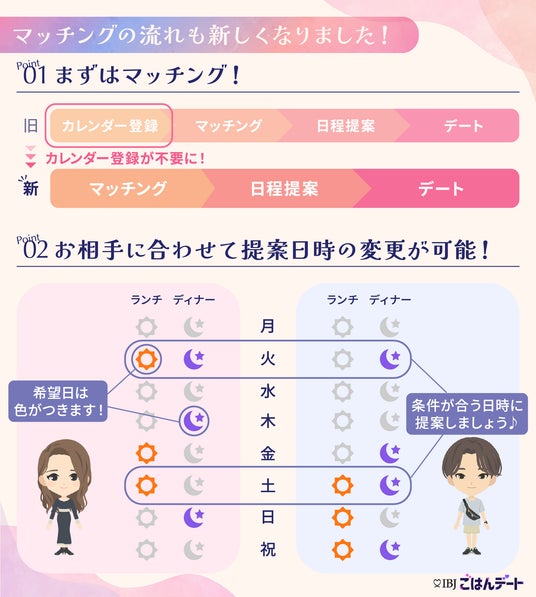 これまでデート希望日のカレンダー登録が必須でしたが、今後は気になるお相手とすぐにマッチングできるようになり、フローがシンプルになりました。