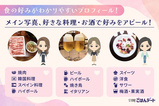 食の好みや価値観が伝わるプロフィールと、マッチングからデート開催までがわかりやすいシンプルなフローで、さらに利用しやすくなったIBJごはんデート。食の好みから素敵な出会いを見つけませんか?