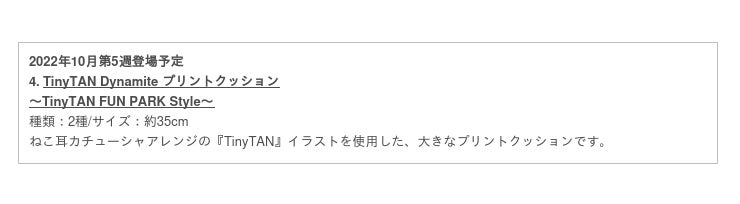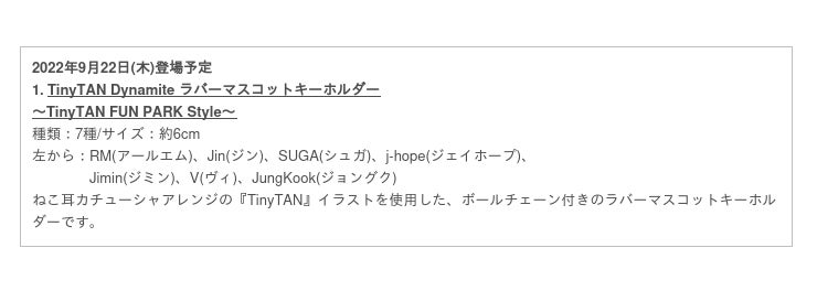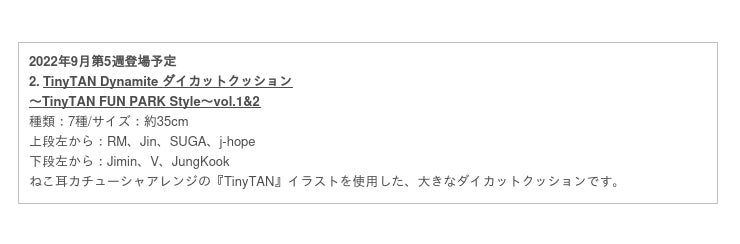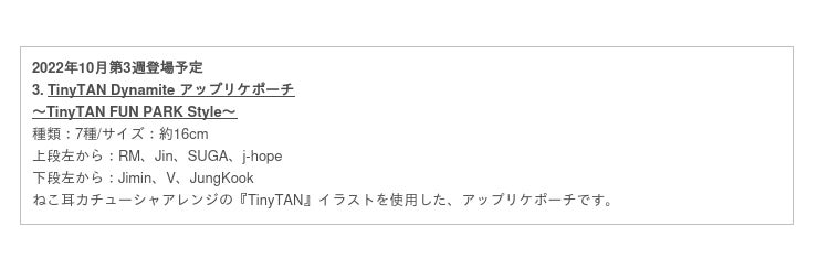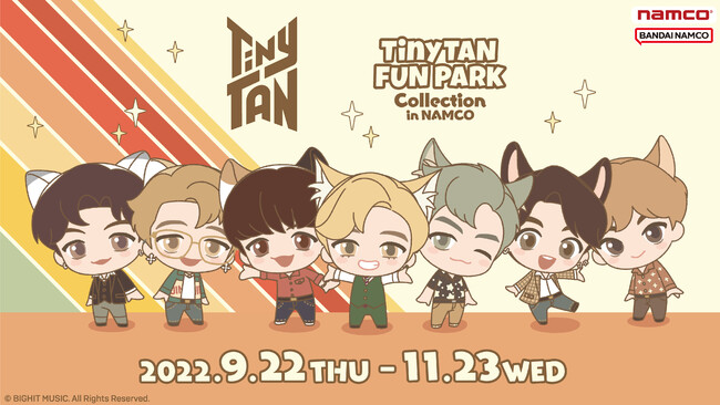 株式会社バンダイナムコアミューズメントは、「BTS」のキャラクター『TinyTAN』のキャンペーン第2弾”TinyTAN FUN PARK Collection in NAMCO”を2022年9月22日(木)~11月23日(水・祝)まで、全国約200店舗の直営アミューメント施設「namco」およびネットクレーンモール「とるモ」で開催します。