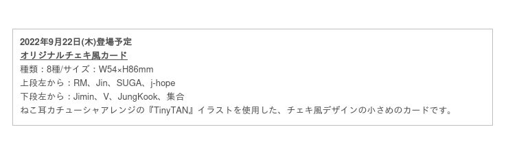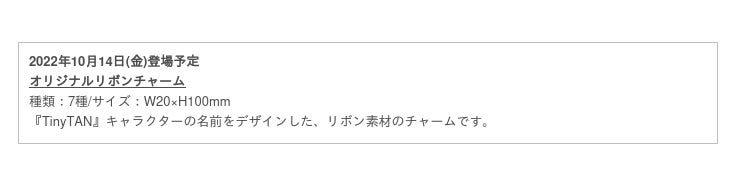 オリジナルノベルティは、2022年9月22日(木)から「オリジナルチェキ風カード(全8種)」が登場するほか、2022年10月14日(金)から「オリジナルリボンチャーム(全7種)」が追加で登場します。
