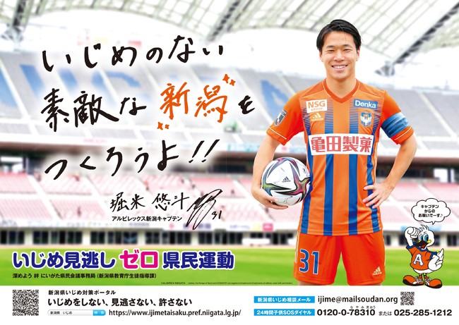 このたび、深めよう 絆 にいがた県民会議事務局が「いじめ見逃しゼロ県民運動」の啓発のために展開するPRポスターに、堀米悠斗選手が初めて起用されることとなりましたので、お知らせいたします。なお、本県民運動のPRポスターに、当クラブトップチーム選手が起用されるのは2年連続となります。