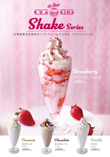 リニューアルオープンに合わせ、クア・アイナ初となる「シェイク」をルミネエスト新宿店限定で販売します。バニラ、チョコレート、ストロベリーに加え、クア・アイナならではのココナッツのシェイクを含む全4種のラインナップをご用意いたします。