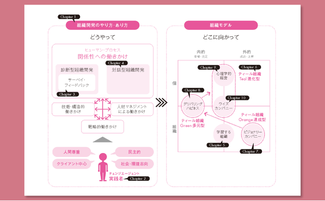 そして、本書では「組織開発のやり方・あり方」と「組織モデル」を10のChapter(章)で説明しています。1つのChapterは10のツボからできています。どのChapterから読んでも理解できる仕立てとなっているので、興味のあるところから読みはじめてください。