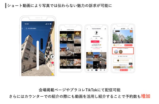 今回のキャンペーン期間中、プラコレウェディングのTikTokでも、結婚式場の魅力を伝える動画を無料で掲載・公開いたします(※動画素材の撮影のみご協力ください)。TikTokでの動画作成&公開に加え、プラコレウェディングの会場ページへのリンクも可能です。この機会に、貴社の魅力をより多くの新郎新婦様にお届けするため、ぜひご参加ください。