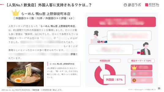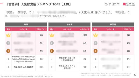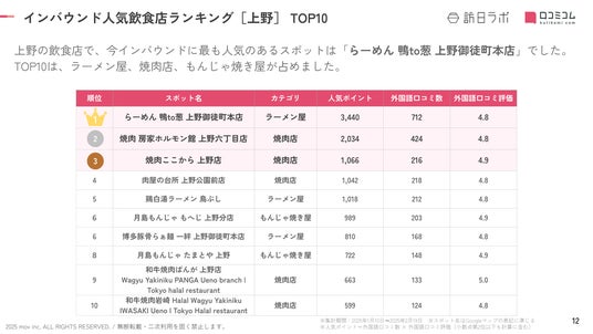 業界最大級のインバウンドビジネスメディア「訪日ラボ」及び 店舗向け集客一元化プラットフォーム「口コミコム」を運営する株式会社mov(代表取締役:渡邊 誠、本社:東京都渋谷区、以下mov)は、上野エリアの飲食店に寄せられた最新の口コミデータから、独自の『インバウンド人気観光地ランキング』を発表しました。