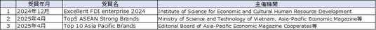 2019年に設立した現地法人「NOMURA REAL ESTATE VIETNAM CO., LTD(以下「野村不動産ベトナム」)」は、現地で推進してきた事業活動が継続的に評価され、優良なFDI※3企業を選出する、「Excellent FDI enterprise 2024 Top10」、ベトナム文科省が主催する、「Top5 ASEAN STRONG BRANDS」、ベトナム現地メディア機関が主催する、「Top 10 Asia Pacific Brands」等複数の賞を受賞し、ベトナム国内での認知力をさらに高めております。