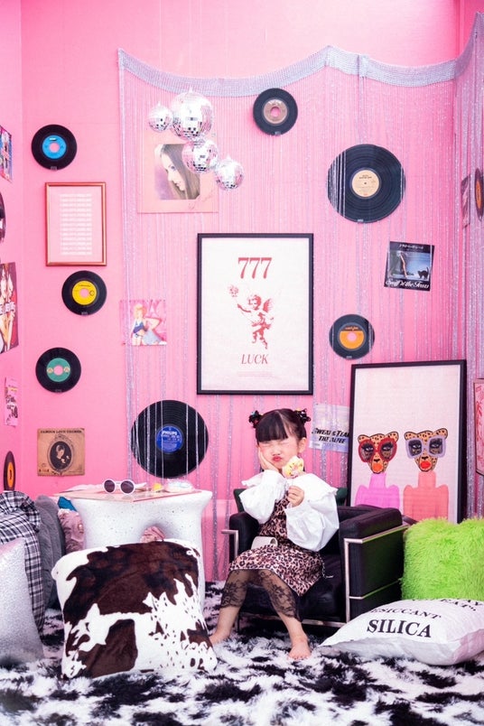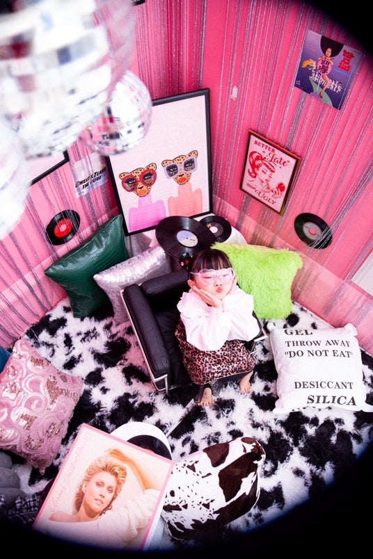 本物のレコードを背景に使用し、ミラーボールと額縁、特徴的な様々なインテリアを組み合わせることでよりこのスタジオの世界観を演出します。