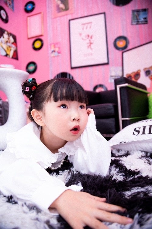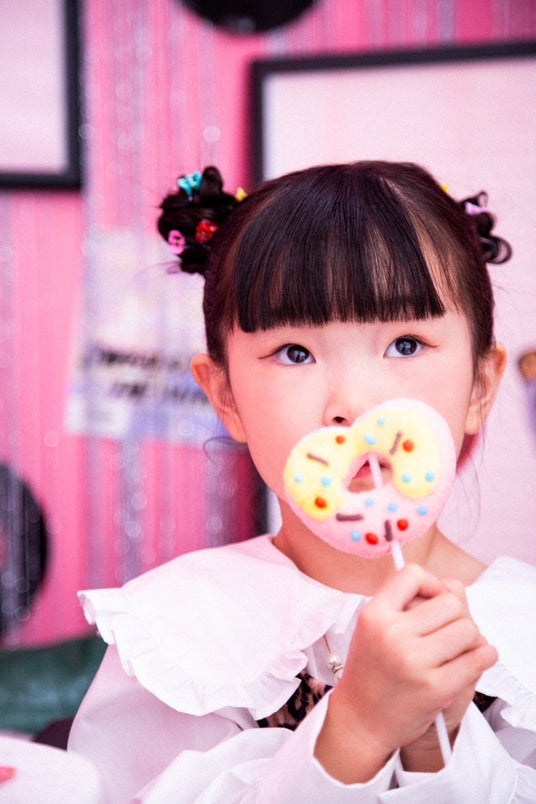 高めのお団子二つ縛りにビビットの髪飾りピンもポイントに。
