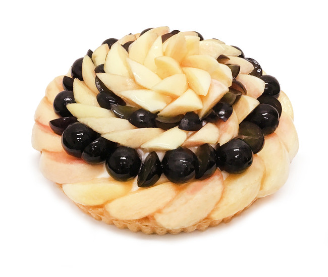 果汁たっぷりの桃と、豊かな味わいのぶどうをあわせて美しく飾り付けました。相性抜群なマスカルポーネのベースと共に楽しめます。