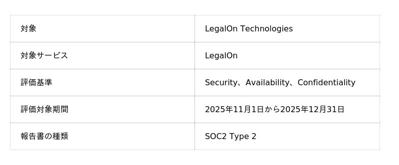 株式会社LegalOn Technologies(本社:東京都渋谷区、代表:代表取締役 執行役員・グループ CEO 角田 望、以下:LegalOn Technologies)は、SOC2 Type 2(System and Organization Controls)報告書を取得しました。本報告書により、当社のサービスのセキュリティ、可用性、機密保持に関連する内部統制のデザイン及び運用状況をご確認いただくことが可能になります。