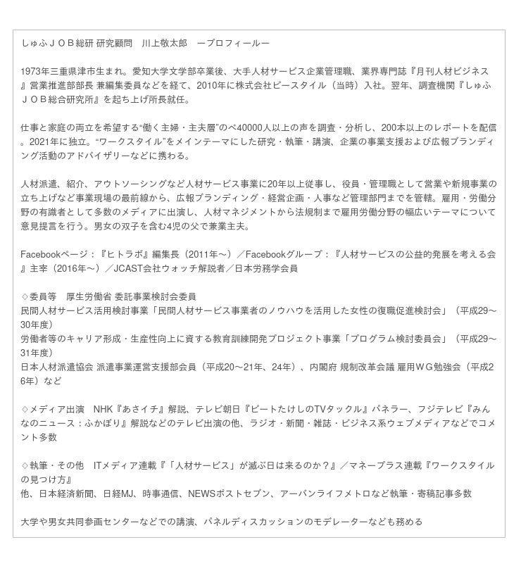 ■しゅふJOB総研 研究顧問 川上敬太郎より